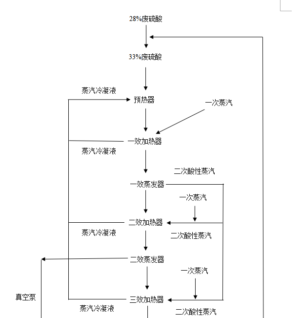 23%的鈦白廢硫酸與60%的成品酸按一定比例進(jìn)行配酸得到31%的廢硫酸。31%的廢硫酸進(jìn)入濃縮系統(tǒng)通過蒸汽三效濃縮到60%。蒸汽濃縮工藝為蒸汽加熱強(qiáng)制循環(huán)的真空濃縮工藝,其原理如下: