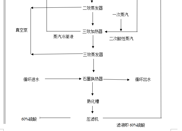 31%的廢硫酸經(jīng)濃縮供料泵泵入臥式凝結(jié)水預(yù)熱器,經(jīng)預(yù)熱器加熱之后的廢硫酸,進(jìn)入一效循環(huán)泵前加入濃縮系統(tǒng),混同循環(huán)酸一并在一效加熱器中同加熱蒸汽換熱、升溫進(jìn)入一效蒸發(fā)器。在一效蒸發(fā)器中真空濃縮**要求濃度的酸在一效蒸發(fā)器中部經(jīng)酸溢流管**二效循環(huán)泵前進(jìn)入二效循環(huán)系統(tǒng),混同循環(huán)酸一并在二效加熱器中同由一效蒸發(fā)產(chǎn)生的二次酸性蒸汽換熱、升溫進(jìn)入二效蒸發(fā)器。在二效蒸發(fā)器中真空濃縮**要求濃度的酸在二效蒸發(fā)器中部經(jīng)酸溢流管**三效循環(huán)泵前進(jìn)入三效循環(huán)系統(tǒng),混同循環(huán)酸一并進(jìn)入三效加熱器中同由一效蒸發(fā)產(chǎn)生的二次酸性蒸汽換熱、升溫進(jìn)入三效蒸發(fā)器。在三效蒸發(fā)器中真空濃縮**要求濃度的酸在三效蒸發(fā)器中部經(jīng)酸溢流管溢流**濃酸熱酸貯槽中,其中未達(dá)要求濃度的酸經(jīng)蒸發(fā)器底部進(jìn)入循環(huán)泵,混同來酸繼續(xù)進(jìn)行循環(huán)加熱蒸發(fā)。進(jìn)入濃縮熱酸貯槽中的酸經(jīng)泵打入石墨換熱器進(jìn)行換熱冷卻,冷卻后的硫酸溢流**熟化槽進(jìn)行三級(jí)熟化結(jié)晶。