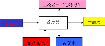 兩個必要組成部分:加熱物料使溶劑(水)沸騰汽化與不斷除去汽化產生的二次蒸汽。一般前一部分在加熱器中進行,后一部分在冷凝器中完成。如圖所示 :真空蒸發基本流程。