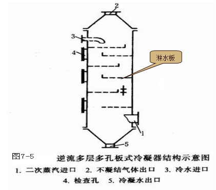 1、孔板式冷凝器:冷凝器是一個用鋼板制成的圓筒,直徑為400-2,000mm。高度為1,200—5,000mm。如圖所示,內裝有若干塊鉆有許多小孔的淋水板,淋水板為交替放置的圓缺型或交替放置的盤環型。冷卻水自上引入,經淋水板小孔穿流而下,同時也經板邊緣溢流而下,二次蒸汽自下而上與冷卻水逆流接觸,換熱冷凝。混合的冷卻水和冷凝水由下部排出,不凝性氣體由上方排出。