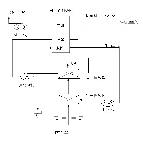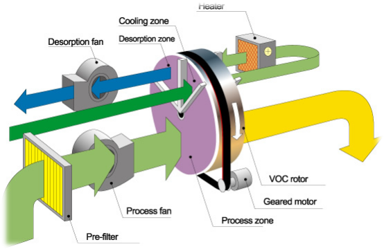 轉(zhuǎn)輪內(nèi)VOCs(volatile organic compounds)被濃縮成飽和沸石區(qū)、再利用熱交換器提供的熱流(約200℃)來進行脫附,脫附完成后旋轉(zhuǎn)**冷卻區(qū),以常溫空氣吹噓冷卻**常溫、再旋轉(zhuǎn)**吸附濃縮區(qū)。