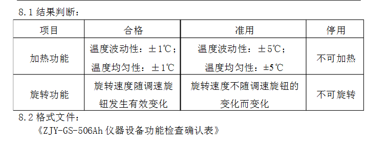 溫度均勻性檢查:把儀器加熱溫度設定為60℃,在水浴鍋內兩個位置各放置一個水銀溫度計(精度0.1℃),計錄各點溫度,并計算**高值與**低值之差。 旋轉功能檢查:打開旋轉開關,設定一個旋轉速度,觀察燒瓶能否勻速旋轉。 對照技術要求。依據8.1結果判斷表,對儀器狀態進行判斷。 7 功能檢查周期 功能檢查周期定為一年。 8 功能檢查記錄及結果評述