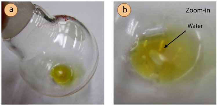 如果蒸發(fā)后在燒瓶中的液體殘留物中看到水滴(圖5.73),則很可能在蒸發(fā)之前沒有有效地從樣品中去除水。要解決此問題,請(qǐng)溶解樣品,使之成為先前使用的溶劑的一部分,使用干燥劑(例如無水( ce {MgSO_4} )),必要時(shí)過濾,然后再次蒸發(fā)溶劑。